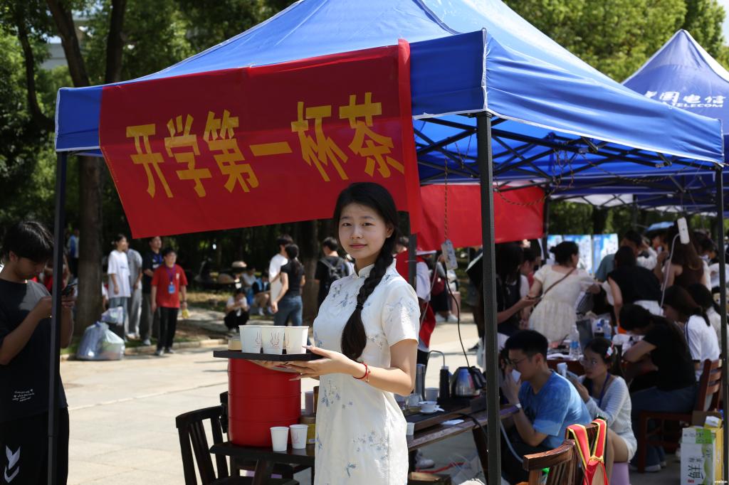 “南苑食堂二楼的瓦香鸡很好吃!”“手机可以绑定学校一卡通。”学长学姐们一句句朴实的话语,传递着跨越年级的温暖。学院茶社还热情的为新生及家长们准备了“开学第一杯茶”。