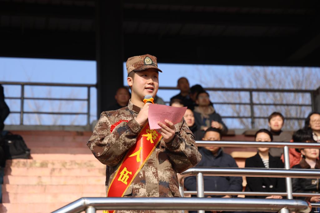2026届定向培养军士生代表23物流军士(1)班于淼发言。他回顾了两年半的学习训练历程,深情感谢母校的培养,激动地表达了自己的坚定决心。表示一定牢记嘱托、服从命令、苦练本领,把青春热血融入强军事业,在军营中践行新时代青年的责任与担当。