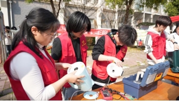 智能电子教师党支部李满老师一边手把手指导学生拆解、检测、排查故障,一边耐心讲解维修要点。针对一台故障频发的空气炸锅,她仔细检测线路与温控部件,快速定位问题,带领志愿者高效完成维修,现场调试正常。