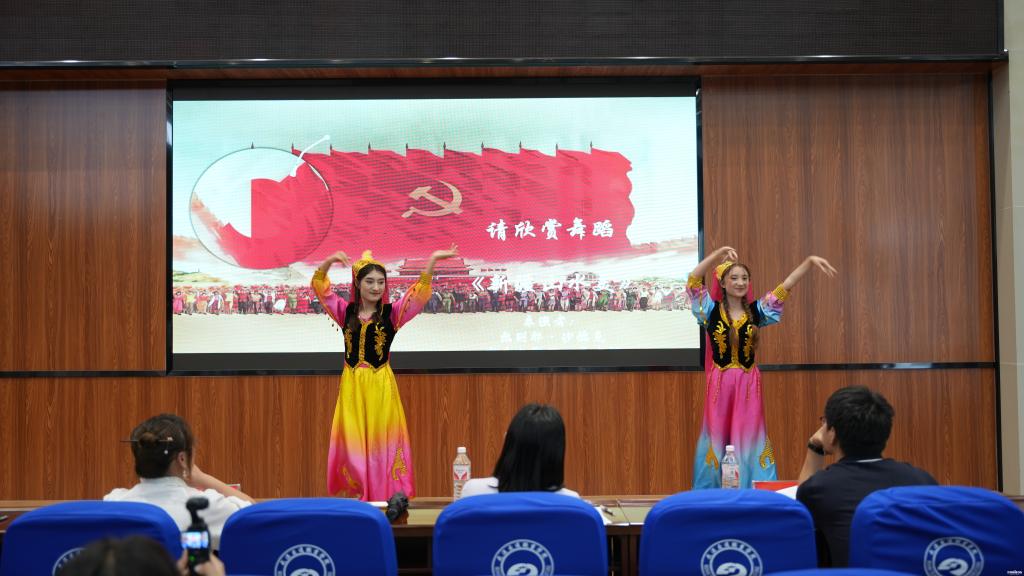 新闻网讯(通讯员 朱亚寅)悠扬的旋律在报告厅响起,维吾尔族传统乐器弹拨尔的音符仿佛带着边疆的风情,回荡在每一个角落。布麦尔耶姆·米吉提和热则耶·沙德克身着飘逸的艾德莱斯绸裙翩然登场,裙摆旋转间宛如雪莲绽放,瞬间点燃了现场气氛。随后,马依拉·买买提和同学们以舞蹈情景剧的形式,生动演绎了民族团结的温暖故事,真挚的情感和富有感染力的表演赢得了现场阵阵掌声,展现了青年学子对“中华民族共同体”的深刻理解与认同。