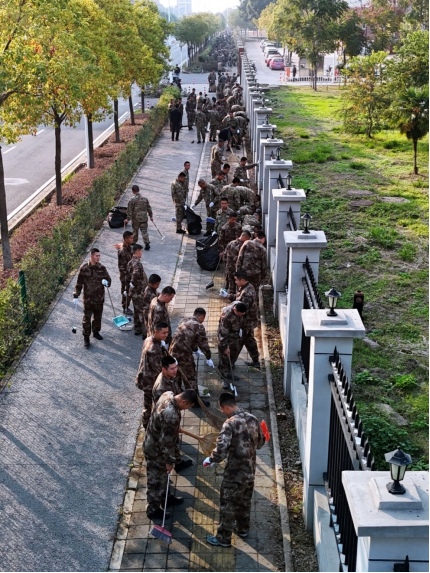 从校门延伸两侧主干道上,随处可见身着统一服装的忙碌身影,军士生们以实际行动绘就了一幅美丽的秋日劳动图画。