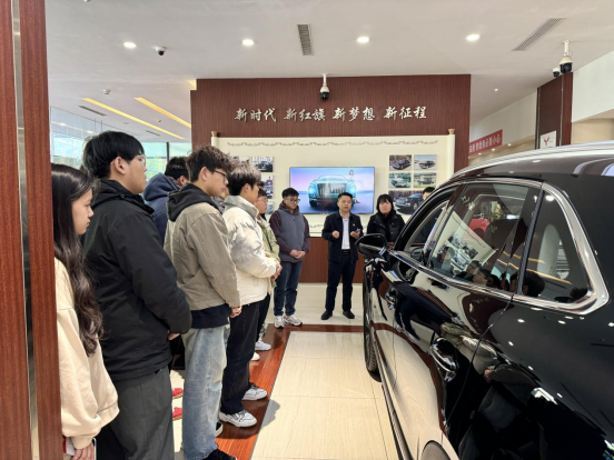活动在沉浸式红色主题党课中拉开序幕。陈金围绕“红旗精神与民族汽车工业”主线,以展厅为讲堂,带领师生回顾了红旗品牌从“国车”诞生到迈向高端化的奋进历程。在一幅幅历史影像与一代代经典车型的呈现中,师生共同感悟红旗品牌的匠心精神、家国情怀与使命担当。这堂走出校园、走进企业的“行走的思政课”,让红色基因、专业认知与价值塑造有机融合。