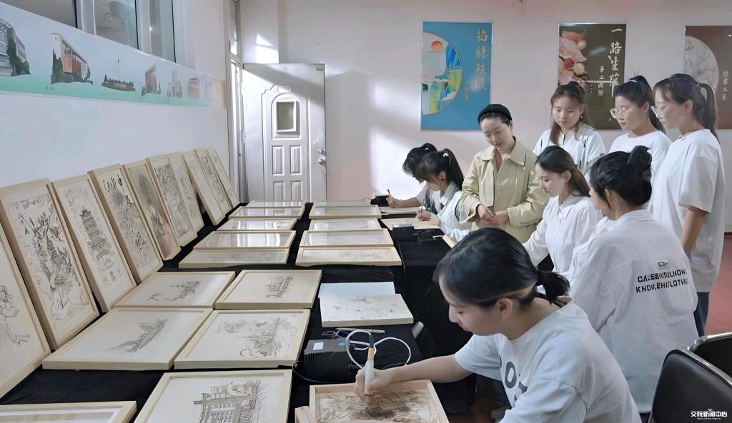 烙画、滴胶、纸浆画、木版年画……在“非遗工坊”,传统技艺不再是书本上的名词,而是可触可感的实践。学院聘请非遗传承人担任校外导师,与校内专业教师、思政导师组成“三师团队”,带领学生开展主题创作。