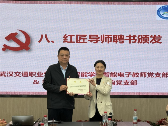 人工智能学院党总支书记黄晶代表党总支聘请光迅科技供应链和采购党支部书记刘军为“红匠导师”,表示未来将不断深化产教融合,利用企业导师参与学院课程教学改革、实训指导与生涯规划,助力学生长远发展。