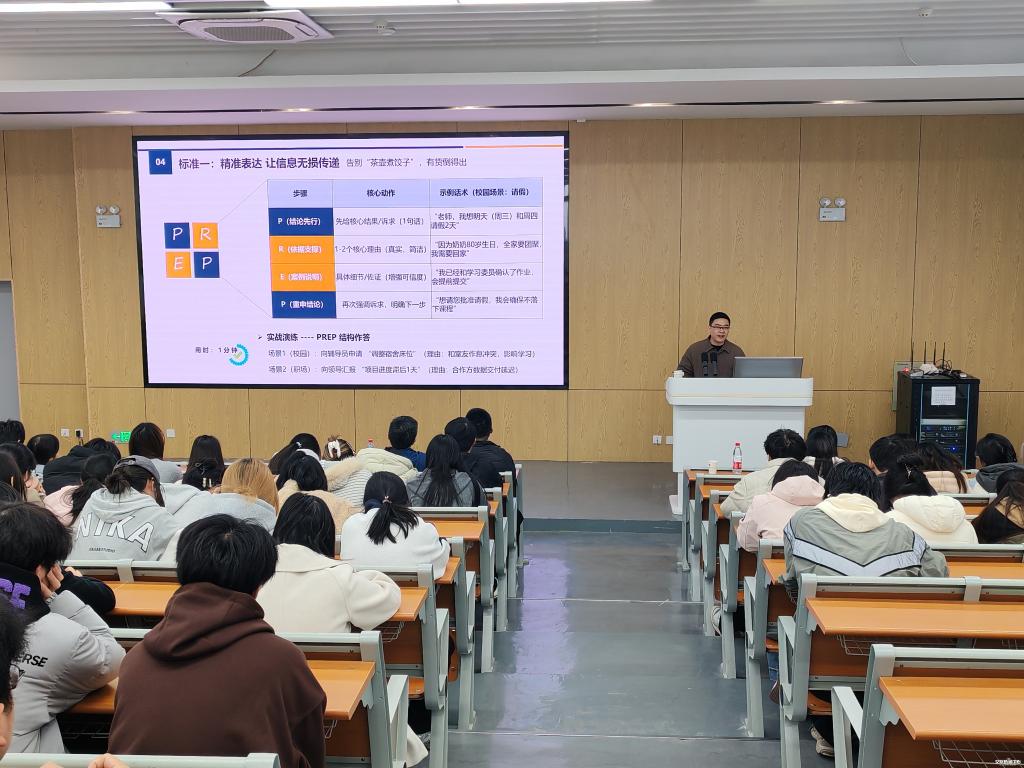 新闻网讯(记者 叶以萌)12月9日,经济管理学院在尚能楼南315举行校企联合党建活动暨“沟通力——从校园到职场的核心引擎”职业能力培训讲座。本次活动由经济管理学院党总支和东风卓联汽车有限公司信息科技分公司联合举办。活动特邀东风卓联汽车有限公司信息科技分公司行政主管董超到校,以“高效沟通赋能职场成长”为主题,通过理论讲解、案例分析、互动演练相结合的形式,赋能学生就业技能提升。经济管理学院副院长朱飞、团总支书记柴永鹏以及80余名24级学生党员、入党积极分子,主要班干部,寝室长等学生代表参会。活动由经济管理学院副院长朱飞主持。