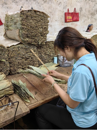 团队成员体验手工分拣箬叶