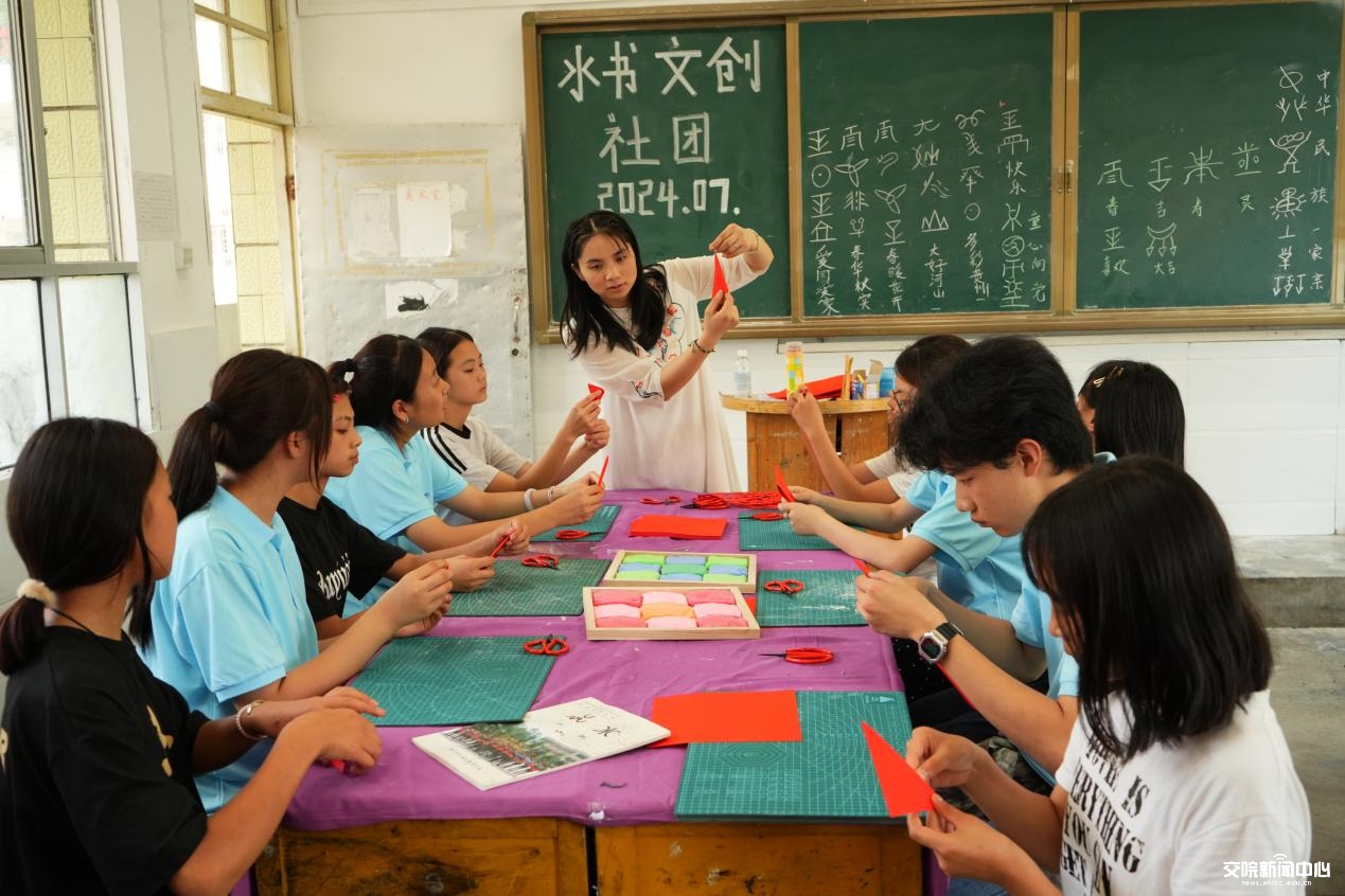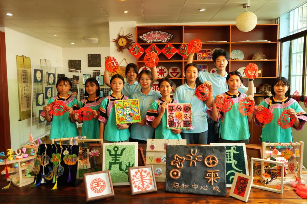在学校彭老师的指导下,实践团同学与小学生们共同制作了水书剪纸、水书黏土,用剪纸剪制“吉祥如意”,用黏土黏出“童心向党”“爱国爱家”,寓意各族学生手拉手、心连心,铸牢中华民族共同体意识。