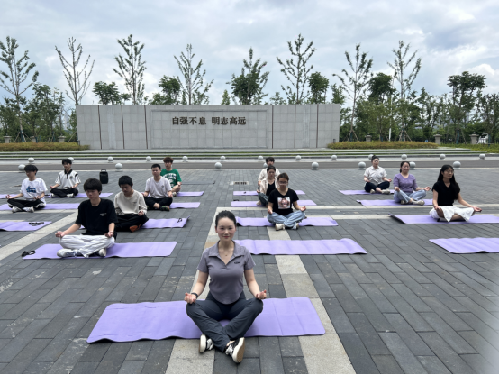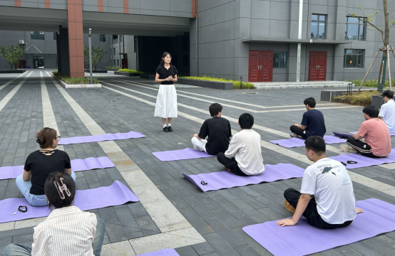 “臀部压实地面,背部立直,头顶向上找天空,大臂自然贴紧胸腔,小臂自然放松,手背轻贴双膝之上”瑜伽教练罗琼老师用轻柔的语言伴着柔和的音乐引导同学们掌握正确的冥想和放松姿势,引导同学们去感受自己的呼吸和微风拂过脸颊的感觉,在一吸一呼之间逐渐放松身体,舒展面部表情。