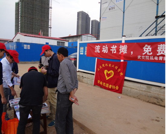 4月26日,机电工程学院青年志愿者协会前往爱家华校名城工地生活区开展了以“关爱工友,心系你我”为主题的流动书摊借书活动。志愿者们利用工人们休息时间,在其工作场所附近提供免费借阅图书的活动,提供了满足借阅对象的图书,为建筑工人们的生活增添一抹书香色。