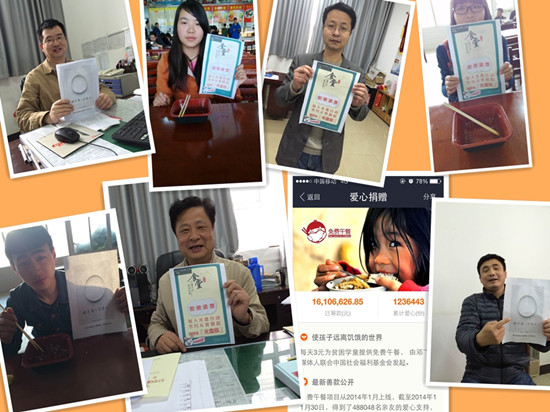 此次活动是以微博挑战的形式展开,即挑战发起者在微博上晒出自己的“光盘”照片,@其他三位好友作为被挑战者,被挑战者必须在24小时内以同样的方式在微博上晒出照片并@其他人,否则就要通过支付宝的爱心捐赠功能为贫困学童捐赠一份3元的爱心午餐。“活动中同学们的参与度很高,在微博上向好友发出挑战,做光盘活动的传播使者,为节俭代言”14级光电一班的团支书表示此次活动很有意义。