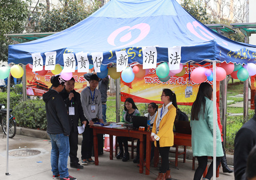 (大学生记者 赵建永 何健)为庆祝第33个国际消费者权益日的到来,3月16日,校生活管理委员会在临湖轩食堂门口开展了3.15知识宣传活动。