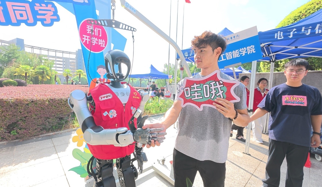无人机在空中轻盈穿梭,精准递送行李;机器人披着志愿者红色马甲,主动伸出“手臂”与新生“亲切握手”;活泼的机器狗摇着“身子”在人群中灵动跳跃,引来阵阵欢笑;还有一群人形机器人随着音乐节奏集体起舞,动作整齐划一。整个校园仿佛变身科技展馆,新生们好奇地驻足、互动,不时发出欣喜的赞叹,现场科技感扑面而来。