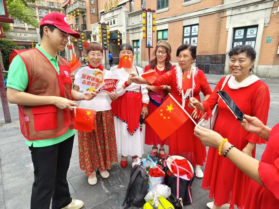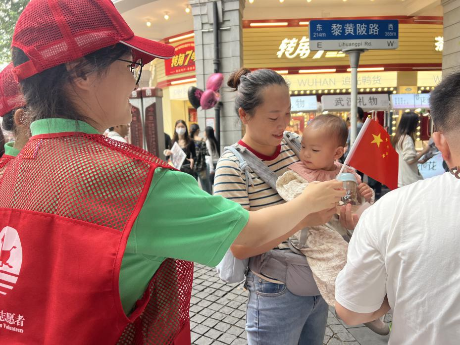 在黎黄陂路上,志愿者们化身“文明向导”,一边向游客递上鲜艳的小国旗,一边耐心讲解街区的历史文化背景。“这条街保留了众多百年老建筑,往前走50米就是标志性的巴公房子,很适合拍照打卡。”遇到游客驻足咨询游览路线,志愿者立刻拿出地图,细致指明周边景点与公共设施位置,还不忘提醒“节假日人流较多,请注意保管好随身物品”。“我生在武汉、长在武汉,能把家乡的故事讲给天南海北的人听,看着他们接过国旗时眼里的光,我心里比谁都甜,再累也值!”志愿者曾文静脸上挂着浓浓的笑意。