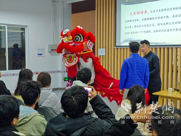 梅教授以“非遗千年舞动:中国龙狮的精神基因”为题开讲。他通过动态课件展示不同朝代的龙狮画像、老艺人传承技艺的影像资料,还现场举起狮头道具,让抽象的文化知识变得可触可感,瞬间点燃学生兴趣。