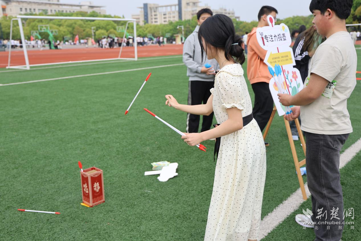 运动会设置个人挑战、团队协作及师生同心三大板块,在个人挑战区,运动氛围张弛有度。“摸石头过河”赛道上,同学们双脚各踩一块瑜伽砖,手持第三块瑜伽砖交替前铺、移步换转。有人重心不稳,慌忙挥臂保持平衡,引得围观同学阵阵惊呼;有人节奏沉稳,三步并作两步快速抵达终点,额角汗珠与脸上笑容相映成趣。“指压板运水”区域,同学们手持水杯在凹凸不平的指压板上稳步前行,杯中的水花随着脚步轻轻晃动,映出他们咬牙坚持的模样。广受欢迎的“逐浪保龄球”场地旁,同学们奋力掷球,“砰”的一声撞到一排矿泉水瓶,欢呼声与掌声瞬间响起,压力仿佛也随这清脆的撞击声消散。与之形成鲜明对比的“专注力投壶”区域则格外安静,参与者屏气凝神,目光锁定前方的投壶筒,手腕轻抖间,箭矢划出一道优雅的弧线,“叮”地一声落入壶中,在动静转换间培养“水滴石穿”的专注力,助力学生实现多维度心理成长。