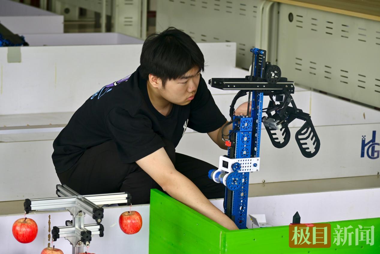 在移动机器人项目国家集训基地,机器人的机械臂夹住一个白色篮子出发了。到达几颗“熟透”的“苹果”前,它伸出“手臂”精准抓住一个“苹果”,“吧嗒”一下迅速摘下放入篮子里。整个动作不超过3秒。