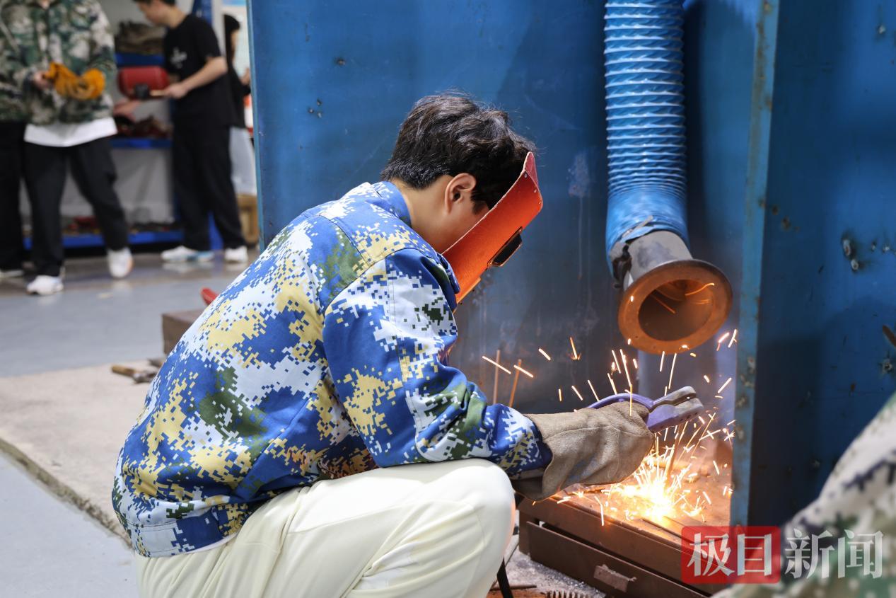 焊接技术赛区的空气里弥漫着金属灼烧的独特气息。十余个操作台前,参赛学生们头戴防护面罩,手持焊枪,专注地在钢板上“缝纫”出一道道笔直焊缝。飞溅的火星如流星雨般散落,空气中响起“滋滋”的电流声。