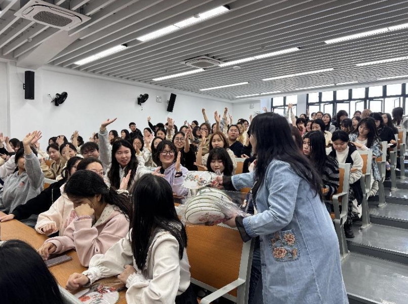 在实践互动环节,黄春萍老师通过大屏幕实时投影,一步步拆解汉绣技法奥秘。“平针铺底色要‘稳’,打籽针点缀需‘准’,滚针勾轮廓得‘活’……”她一边讲解,一边穿梭于学生之间手把手指导。2024级财富管理专业学生李艺亨在尝试绣制梅花时屡屡“卡壳”,黄老师轻捏她的手指调整角度,说:“针尖倾斜15度,手腕放松,让丝线自然流淌。”三分钟后,一片栩栩如生的梅花跃然扇面。
