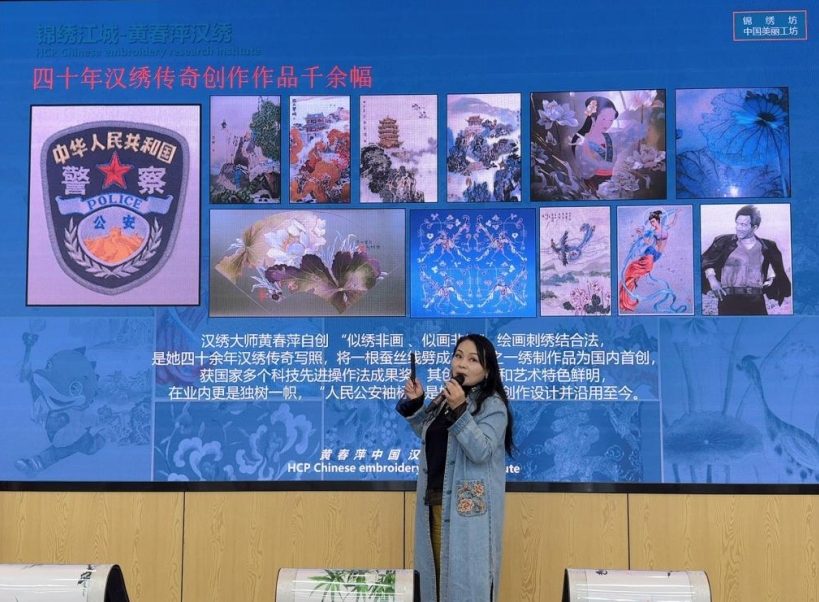 黄春萍老师以“汉绣之美:从楚韵到当代”为主题,通过图文并茂的讲解,带领同学们追溯了汉绣两千余年的历史脉络。从战国时期楚地绣品的灵动纹样,到明清“绣铺林立”的繁荣景象,再到现代汉绣在创新中焕发的新生,黄老师用生动的故事串联起汉绣的“前世今生”。