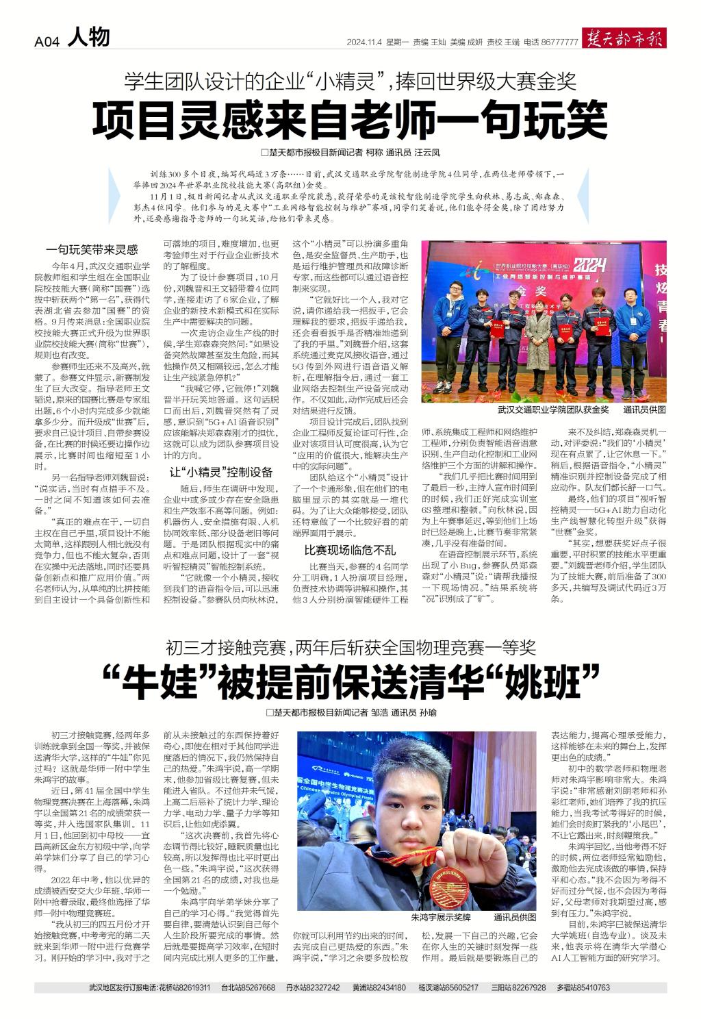 11月1日,极目新闻记者从武汉交通职业学院获悉,日前,在内蒙古自治区包头市举行的2024年世界职业院校技能大赛(高职组)“工业网络智能控制与维护”赛项中,该校智能制造学院学生向秋林、易志成、郑森森、彭杰不负众望,在刘魏晋、王文韬老师的指导下,一举将大赛金奖收入囊中。同学们笑着说,这份荣誉来自师生的努力,也离不开老师的一句玩笑话。