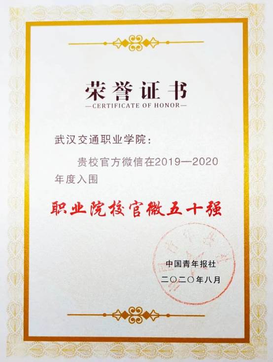 在本次百强榜单中,武汉交通职业学院官方微信位居全国第37名,相比2019年的全国高职院校第87名,提升50名。