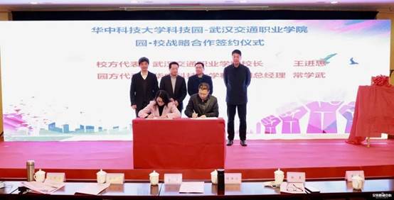 2020年12月8日,华中科技大学科技园与武汉交通职业学院携手召开园·校战略合作签约仪式,仪式在华中科技大学科技园创新基地隆重举行。省教育厅职成处处长何泽云,武汉东湖新技术开发区科创局副局长夏天,华中科技大学科技园董事长童俊,武汉交通职业学院党委书记杨震、校长王进思、副校长姬中英以及园区八家企业代表等出席签约仪式。