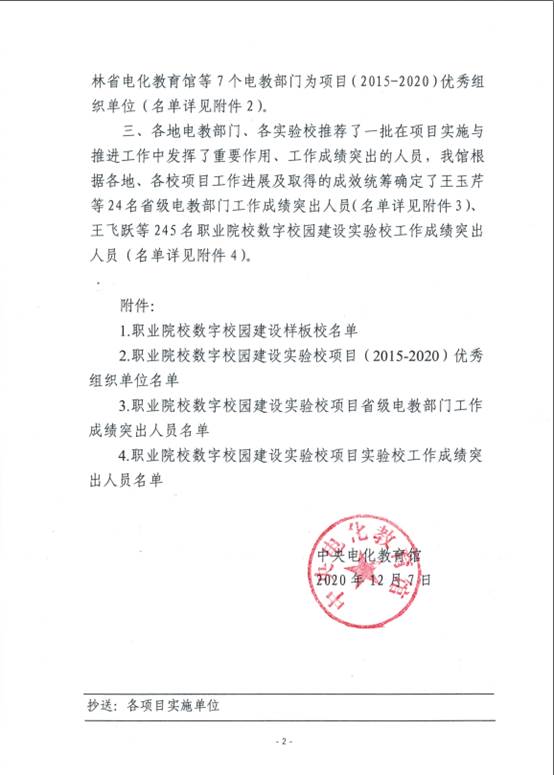 2020年12月8日,中央电教馆发布《关于公布职业院校数字校园建设实验校项目总结工作情况的通知》(教电馆[2020]79号),公布了“职业院校数字校园建设样板校名单”,学校名列其中。