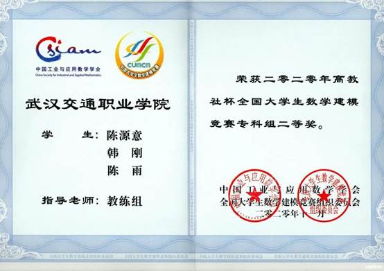 2020年12月初,2020年高教社杯全国大学生数学建模竞赛成绩揭晓。学校公共教学和实践学院数学教研室老师率领9位学生代表武汉交通职业学院参赛并创佳绩,其中一支参赛队伍获得国家二等奖,是今年湖北省获得国家级奖项的四个团队(专科组)之一,另两支参赛队伍也获得湖北省三等奖,实现了武汉交通职业学院在该项赛事的历史性突破,在全省高职院校中名列前茅。