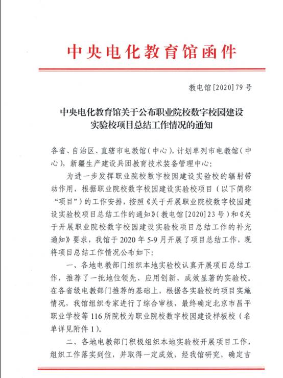 为总结职业院校数字校园建设实验校信息化建设与应用成果,提炼典型经验与作法,更好地发挥职业院校数字校园建设实验校的辐射带动作用,充分发挥典型安全的示范引领作用,推动职业教育信息化深入发展,根据教电馆[2020]23号文件精神,在现有428所实验校范围内,各省推荐了一批地位领先,应用创新、成效显著的实验校。中央电教馆根据各实验校的项目实施情况,组织专家进行了综合审核,最终确定116所院校为职业院校数字校园建设样板校,学校名列其中。