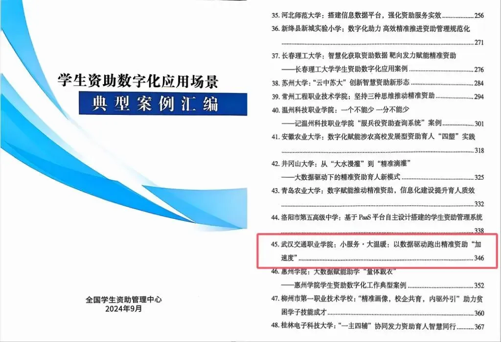 2024年11月11日,教育部全国学生资助管理中心印发《学生资助数字化应用场景典型案例汇编》,我校报送的案例《武汉交通职业学院:小服务·大温暖:以数据驱动跑出精准资助“加速度”》成功入选。