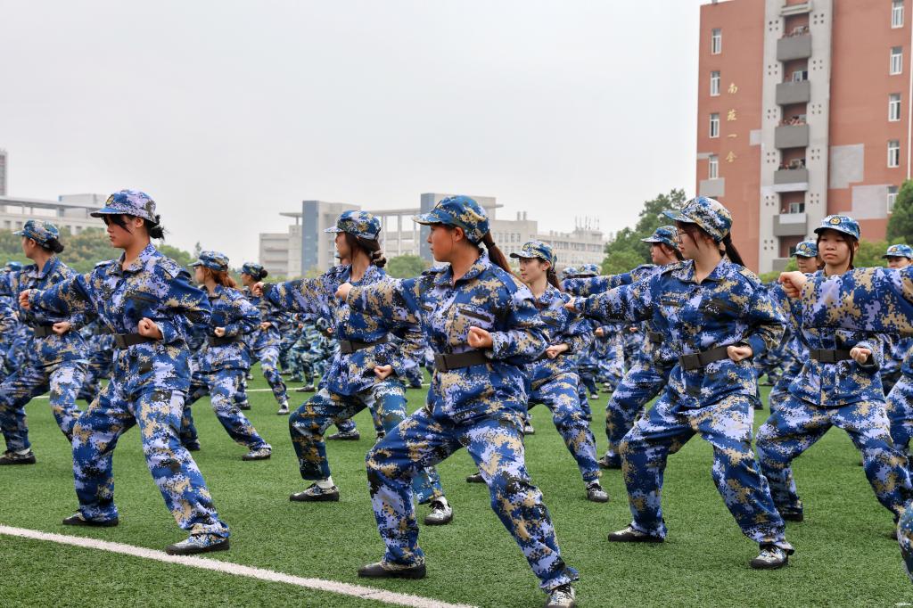 全体新生进行军训成果展示。各学院方阵喊出的铿锵口号响彻武交院上空。