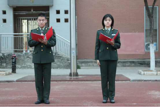 学员代表张文凯、陈果在国旗下发表主题为“青春逐梦强军,奋进崭新时代”的演讲。
